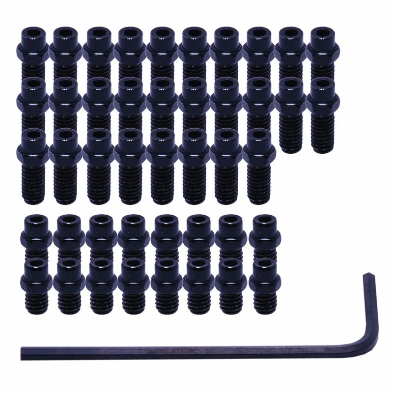 28 x long pins (for use in the outside edge of your pedals) overall length 12.5mm, thread is M4x0.7×9, stud is 4.5mm using either a 5mm spanner or 2mm allen Wrench to secure.